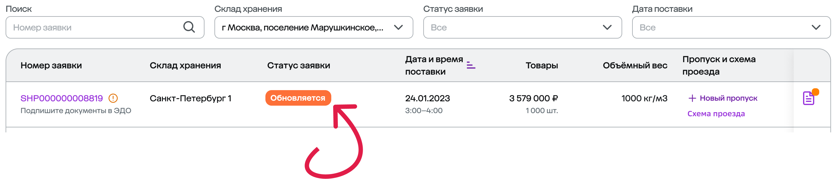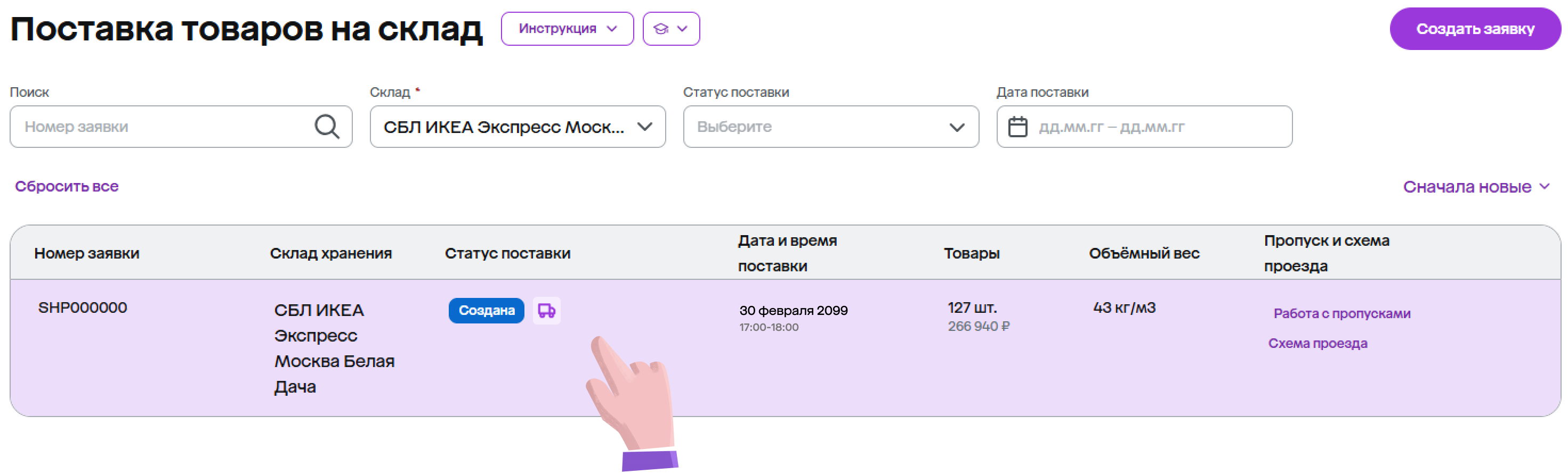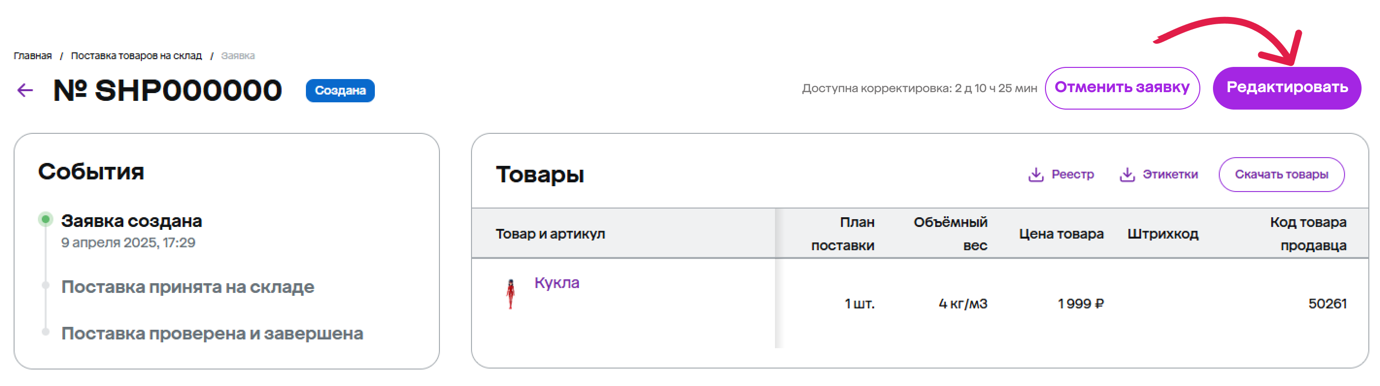 Изменить заявку на поставку можно не позже, чем за 2 часа до планируемой даты приезда.