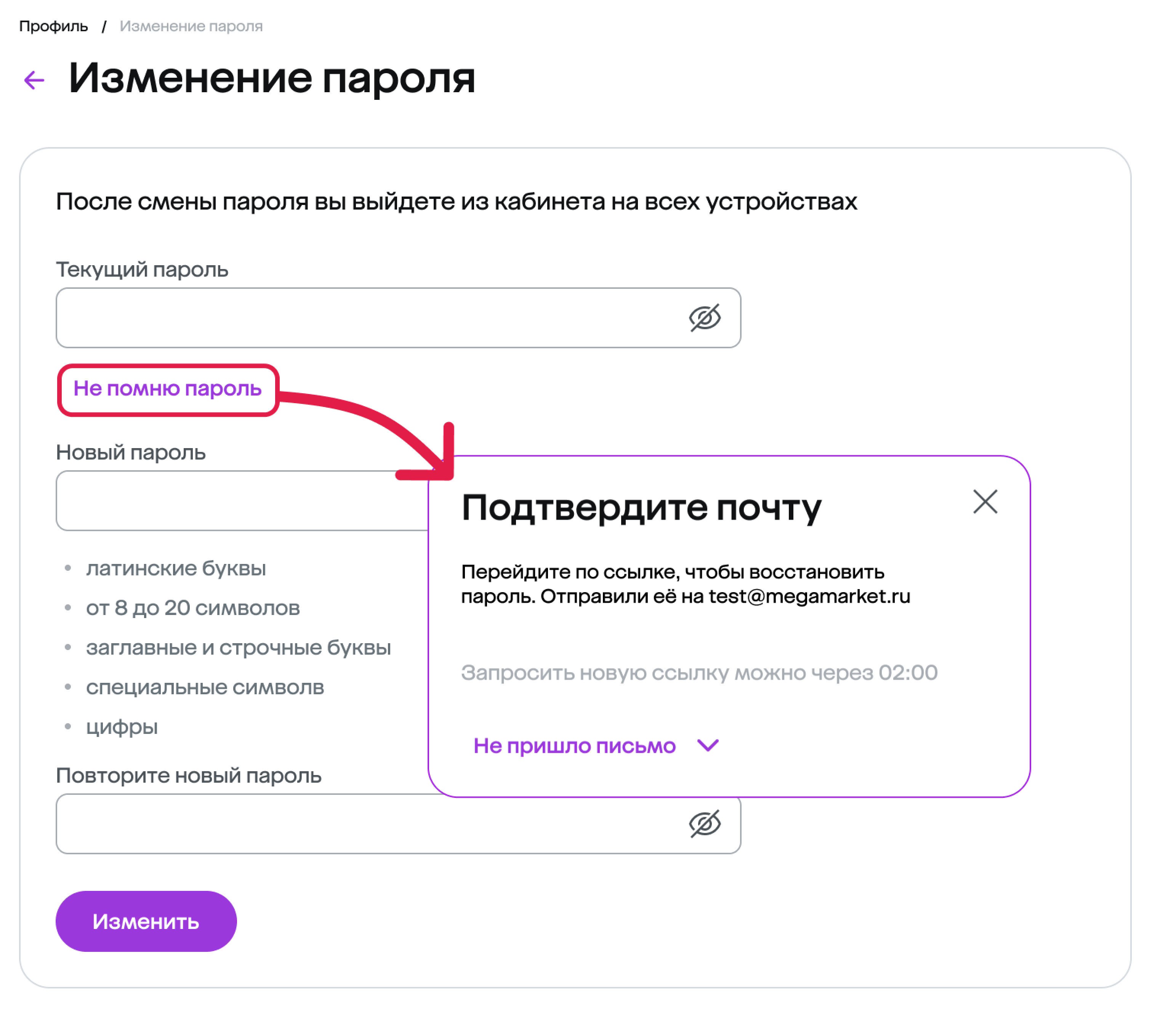1. Кликните Не помню пароль. Вы получите ссылку на его восстановление. Она придёт на email, указанный в профиле.