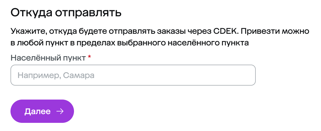 После привязки аккаунта выберите населённый пункт, из которого будете отправлять заказы. Нажмите Далее.