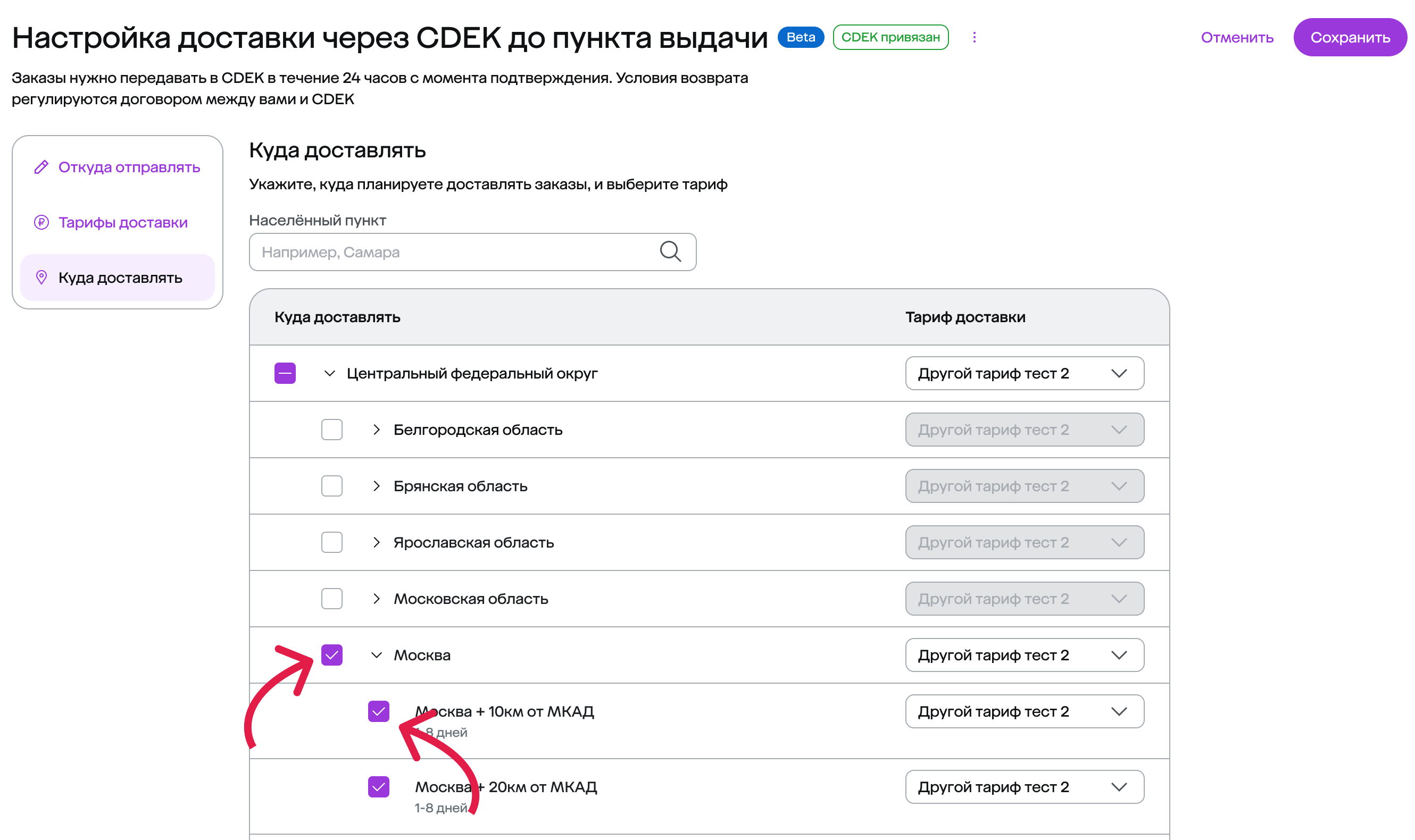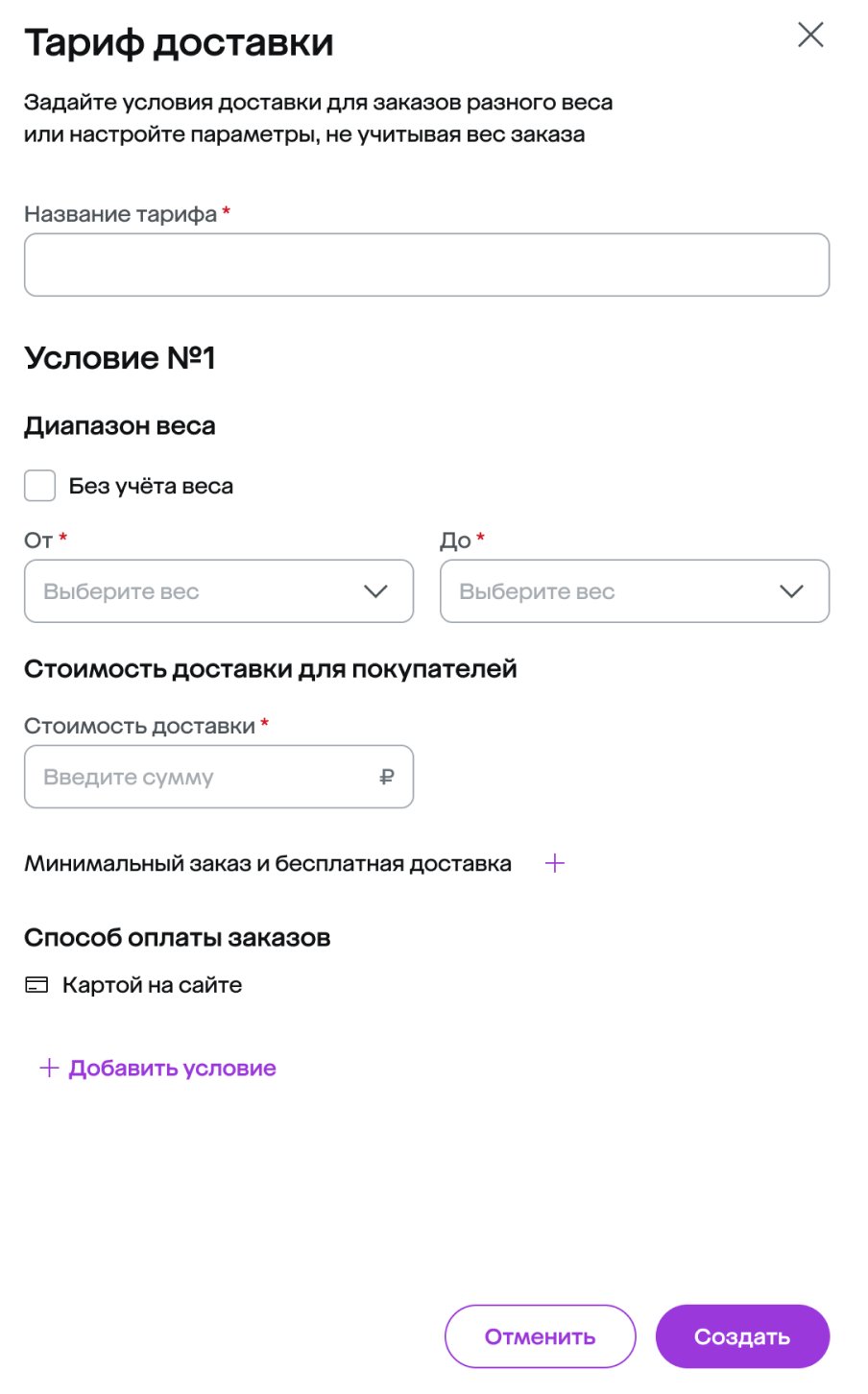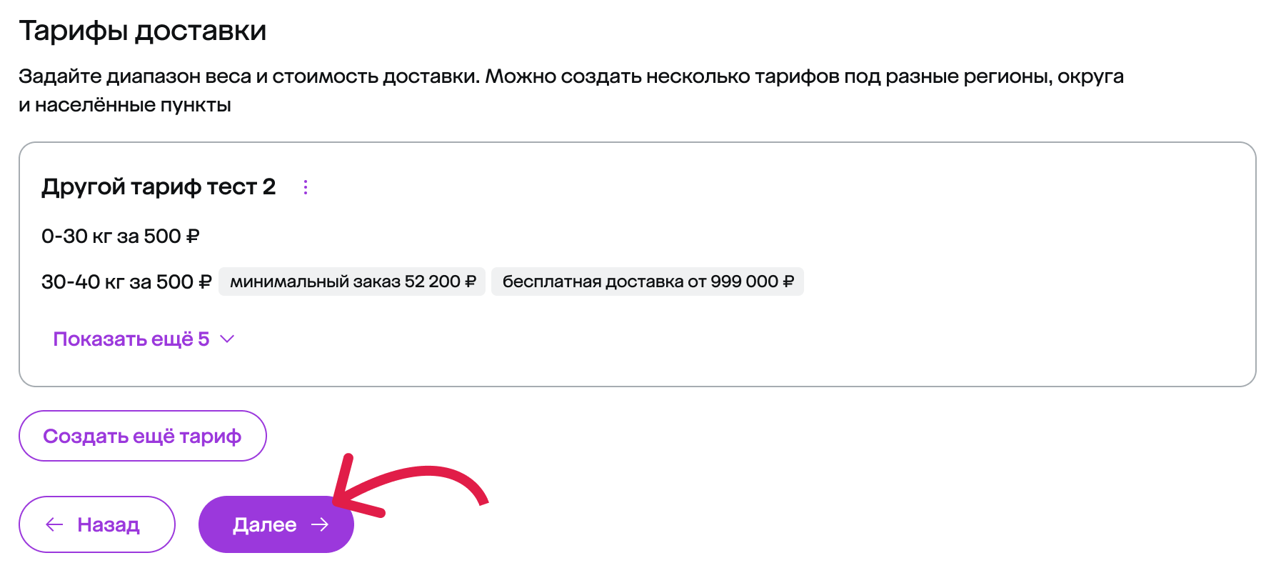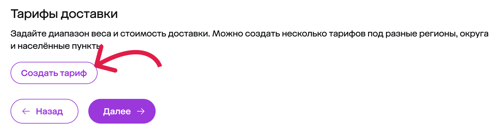 Настройте тариф доставки, нажав на кнопку Создать тариф.