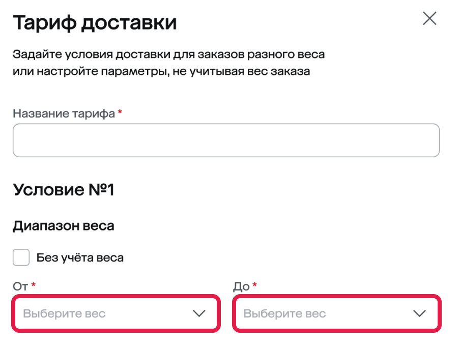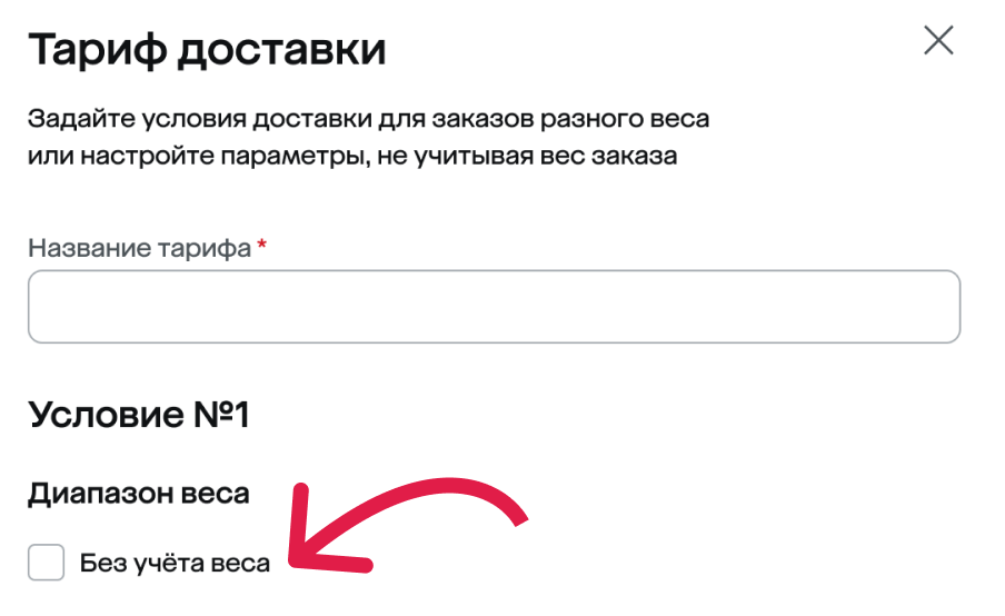 Например, ваш самый большой весовой диапазон — 50-100 кг. Вы хотите настроить условие для всех товаров, которые больше 100 кг. Для этого создайте условия и в строке с диапазоном отметьте Без учёта веса.