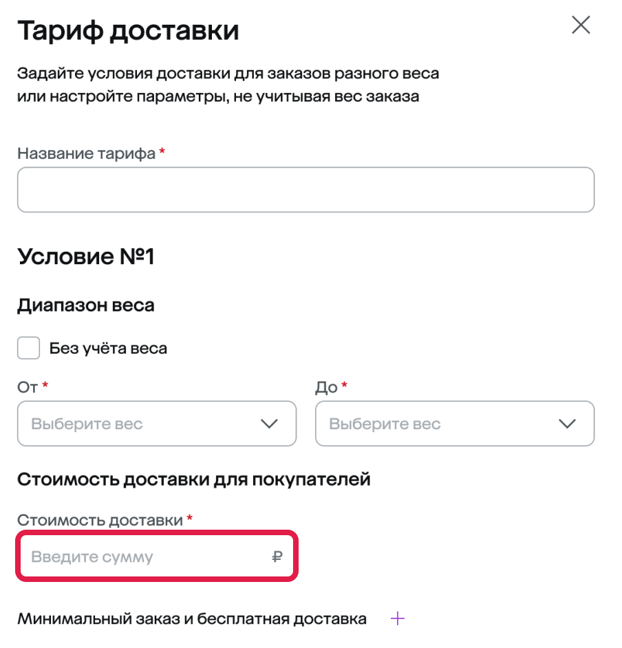 Эту сумму должен заплатить покупатель за доставку его заказа. Также вы можете указать минимальную сумму заказа и условия для бесплатной доставки.