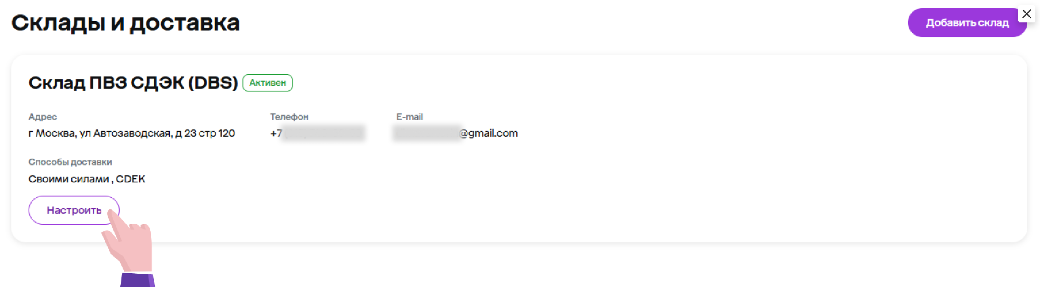 Если вы уже доставляете заказы своими силами и хотите подключить доставку через CDEK, то нажмите Настроить.