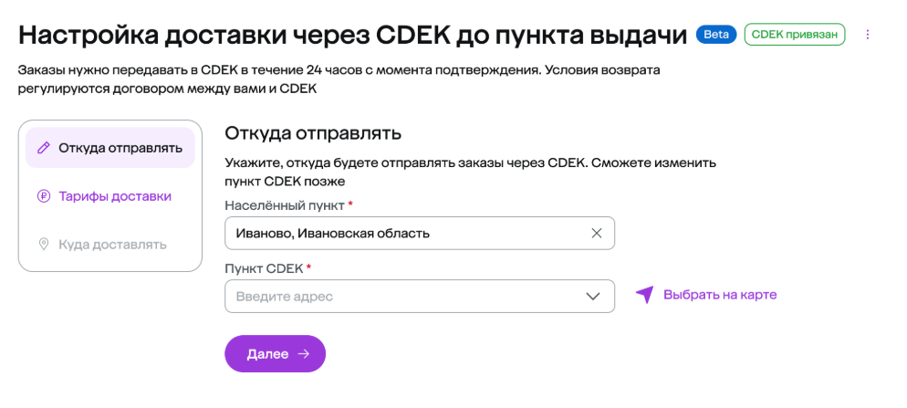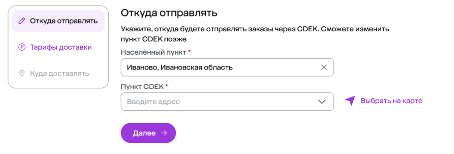 После привязки аккаунта выберите населённый пункт, из которого будете отправлять заказы. Нажмите Далее.