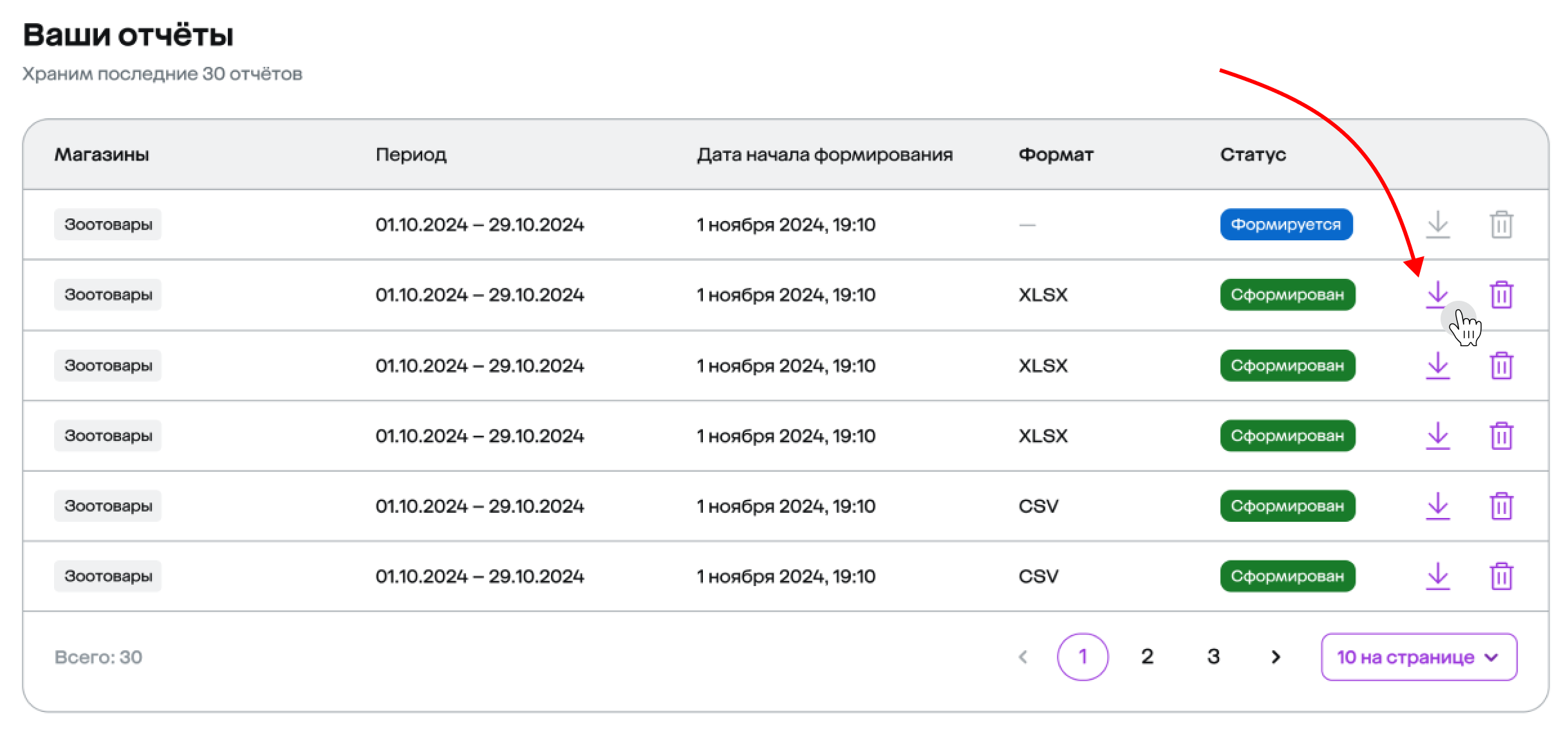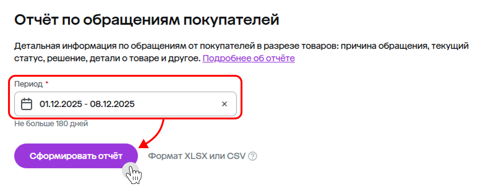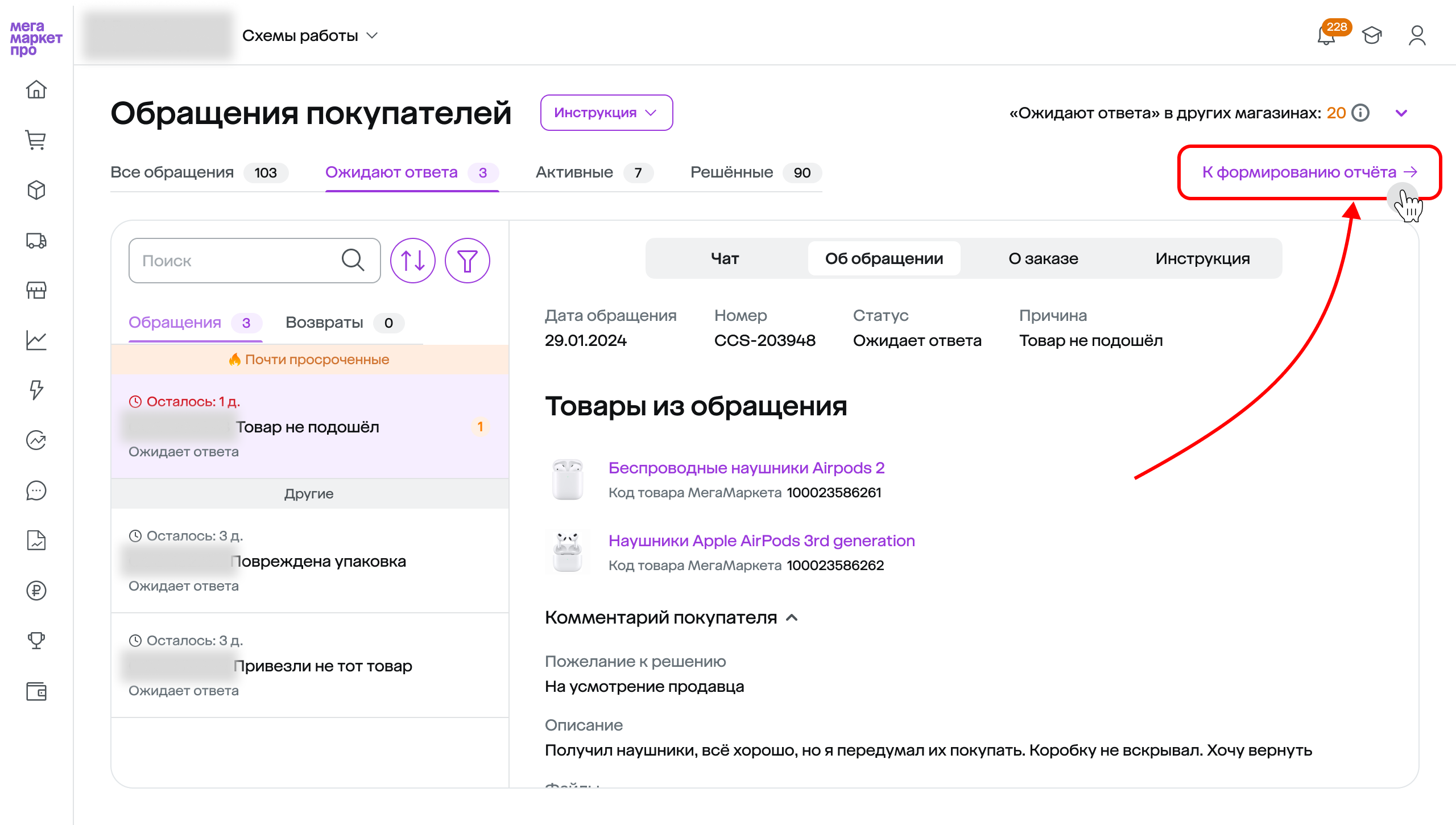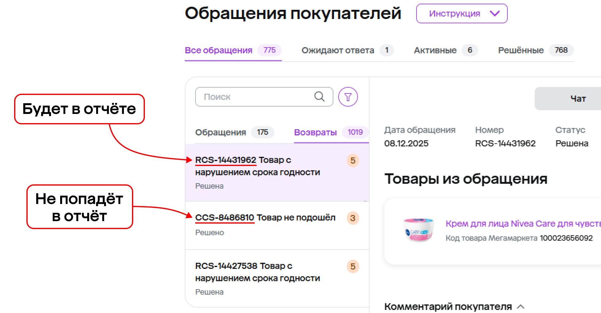 Перейти к формированию отчёта можно из раздела Обращения покупателей.