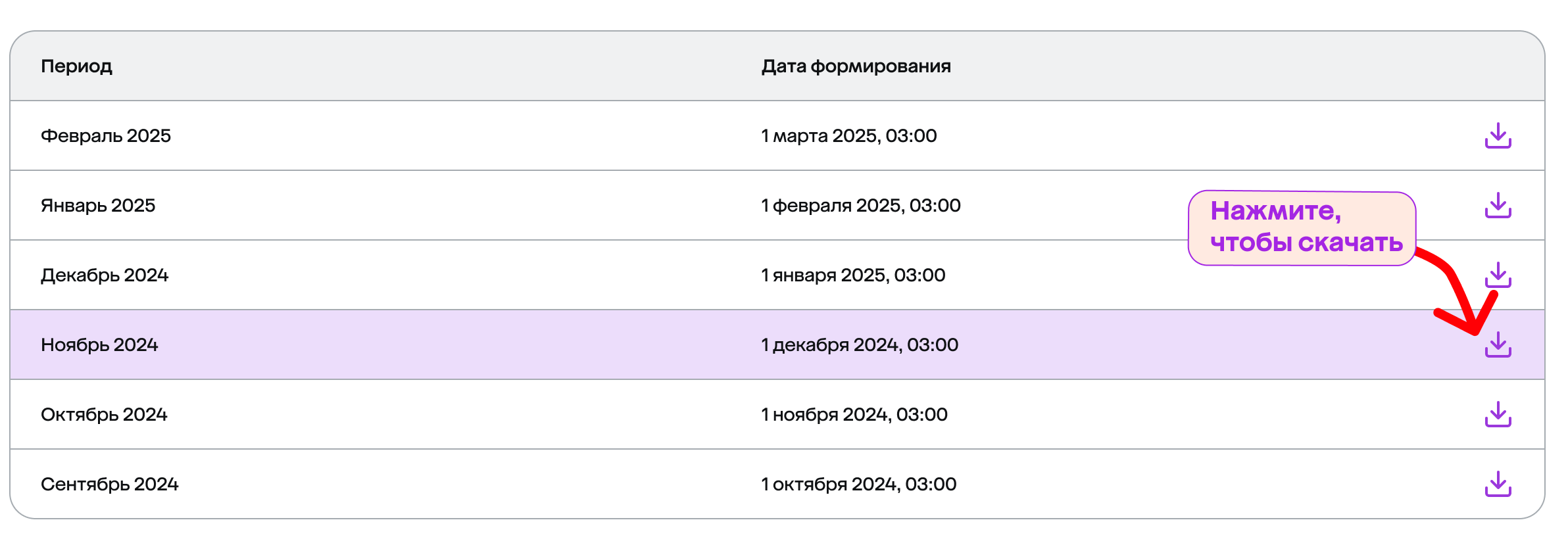 Готово. При необходимости можете скачать ранее сформированные отчёты. Для этого нажмите иконку