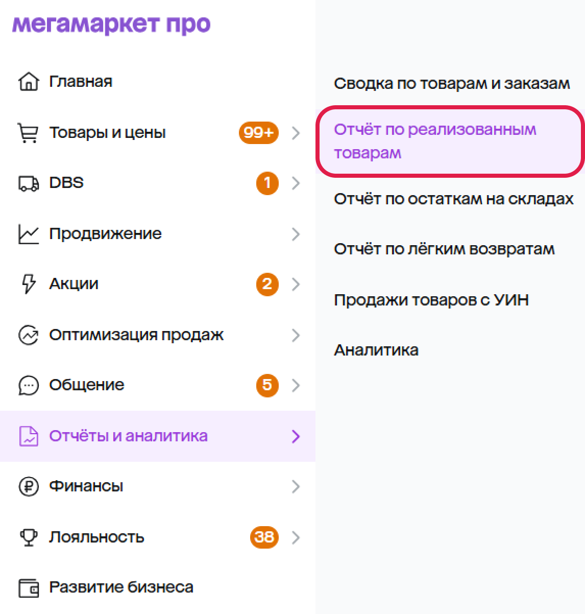 Отчёт показывает информацию о проданных товарах. Находится от в разделе Отчёты и аналитика → Отчёт по реализованным товарам.