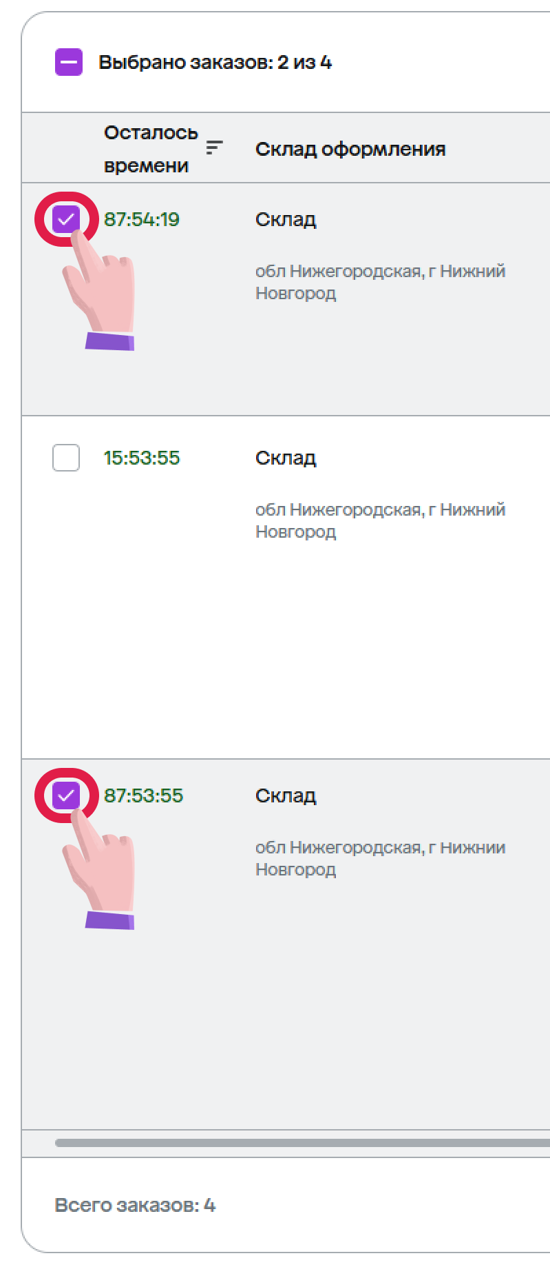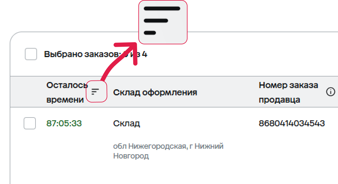 Доступна сортировка по таймеру — удобно первым делом видеть заказы, у которых истекает время на обработку. Для этого кликните на иконку.