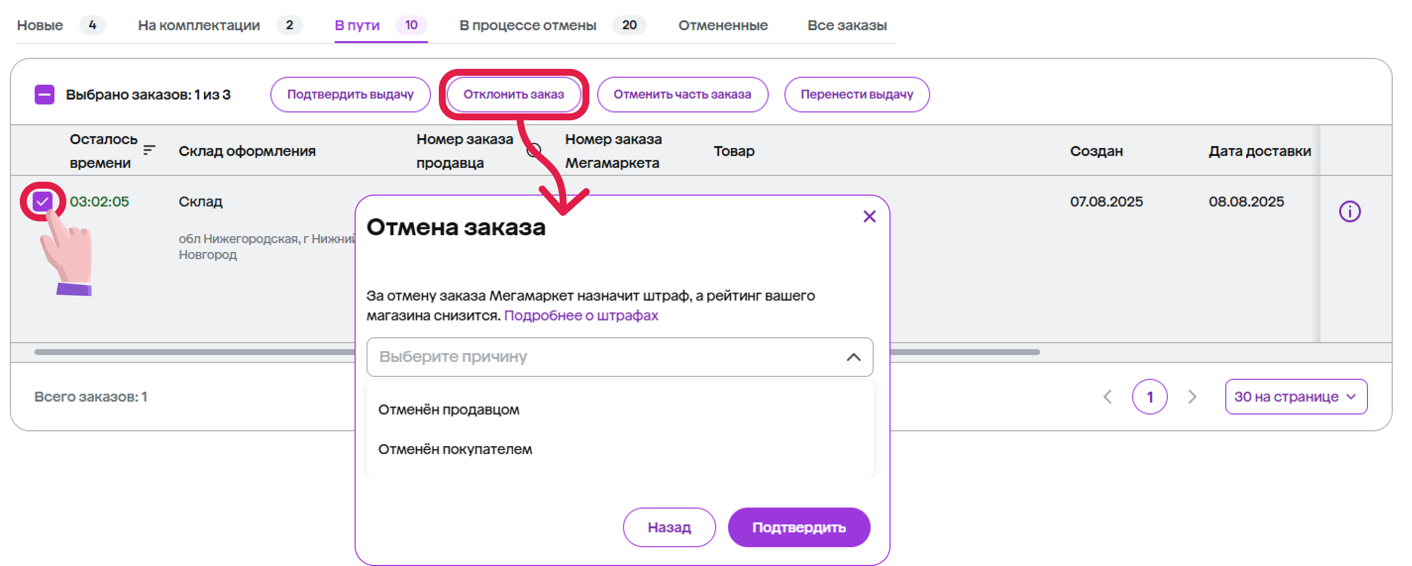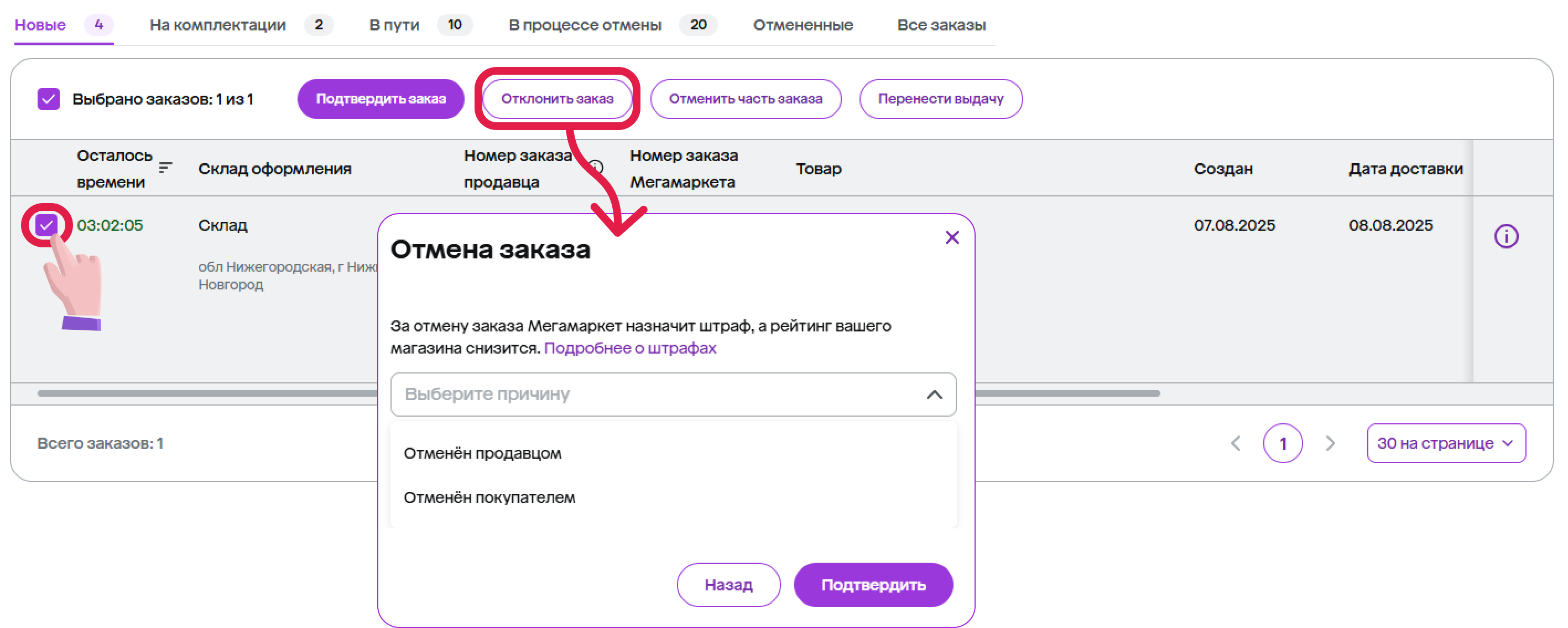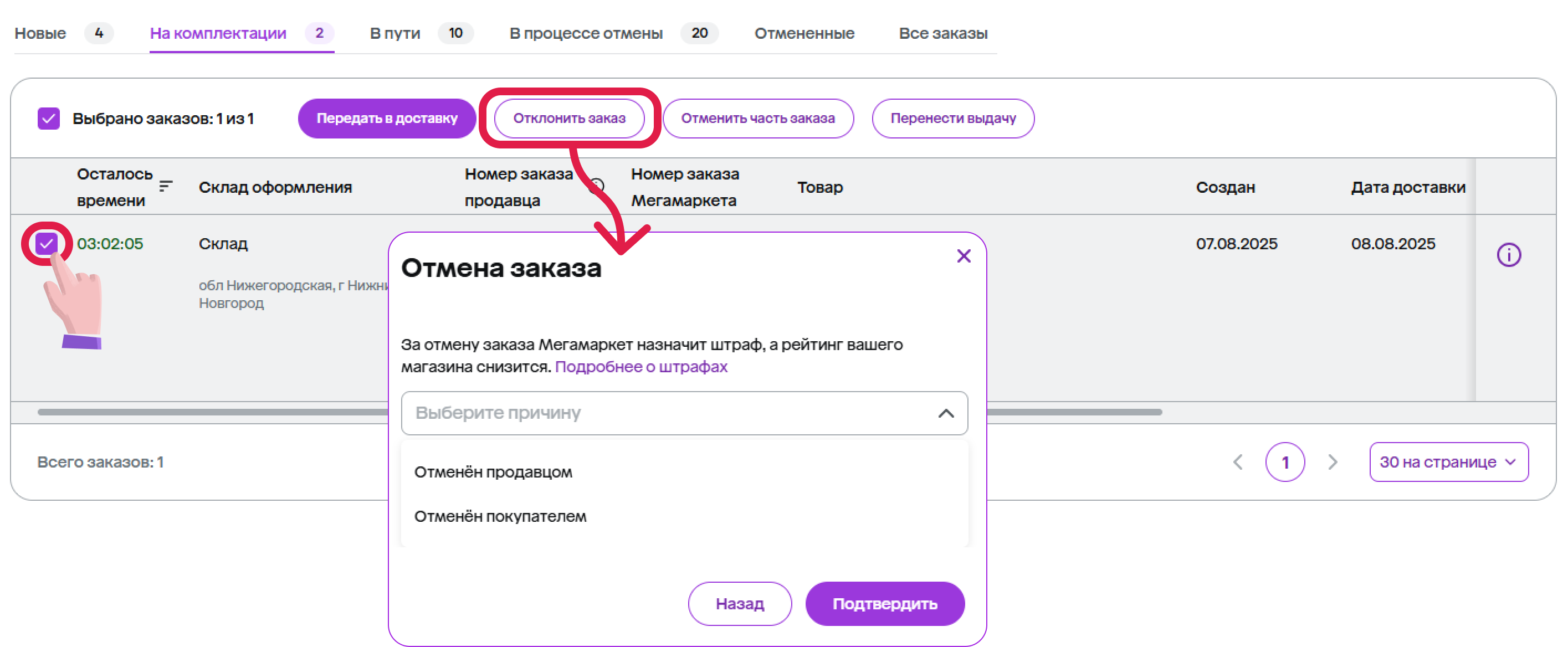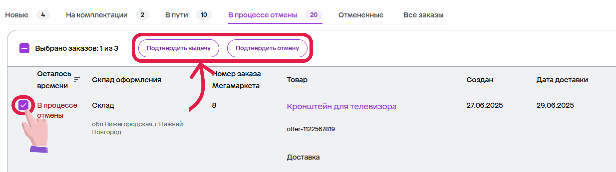 В процессе отмены | Отправления, которые: 1) Отменил покупатель – покупатель может отменить заказ, который находится в статусе «Подтвердите заказ» и «Скомплектуйте заказ». 2) Вы не успели обработать в отмеченное время. У таких заказов нужно подтвердить или отклонить отмену. |