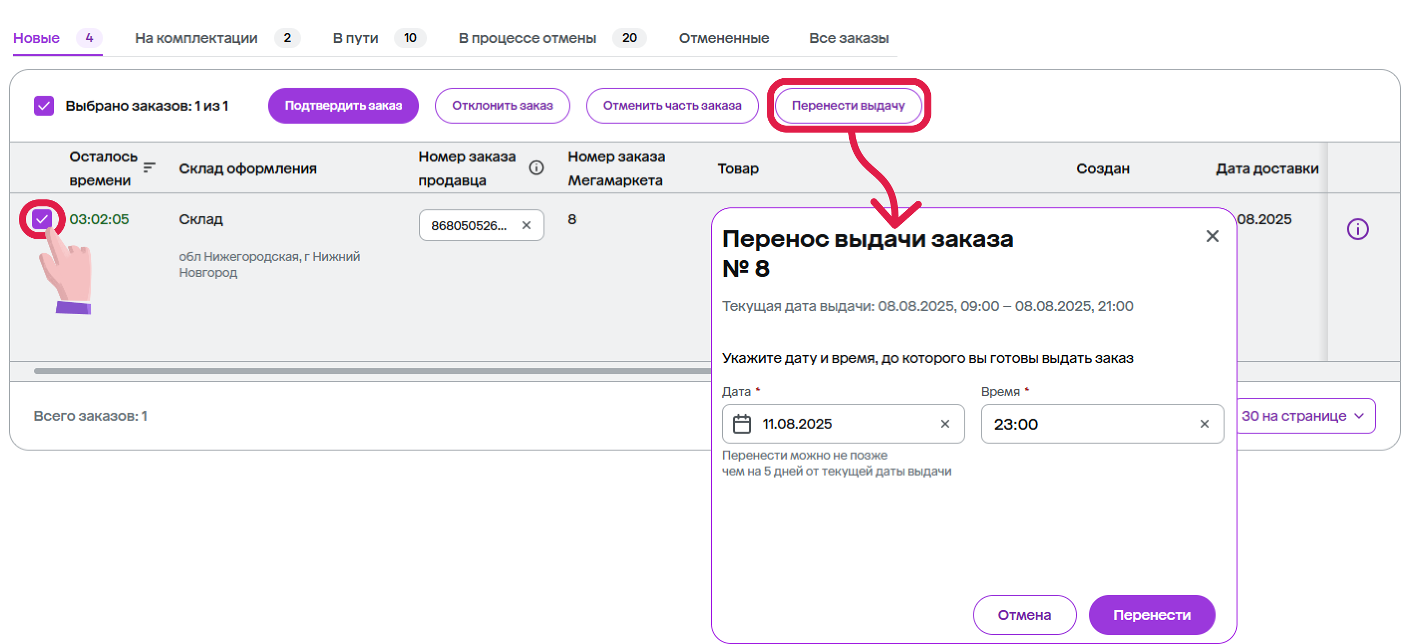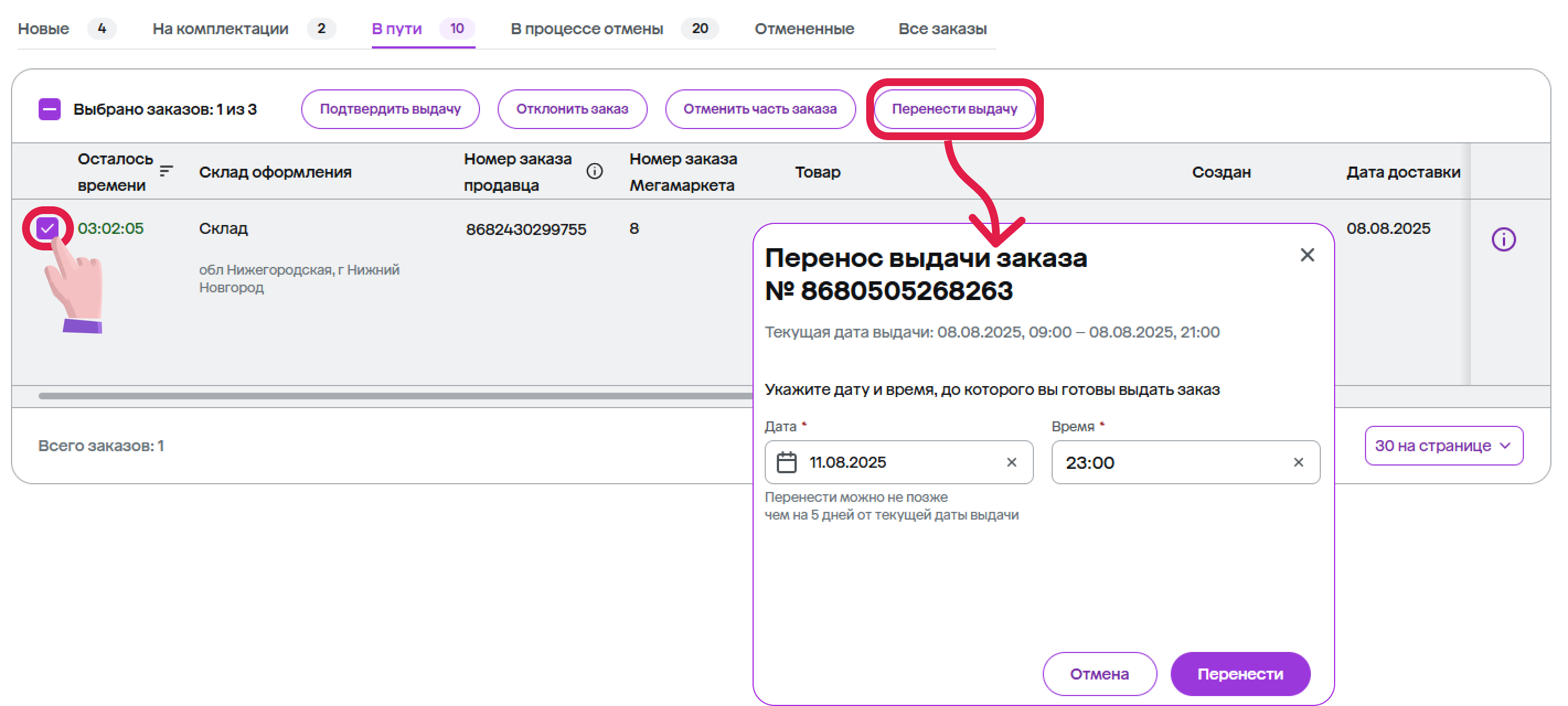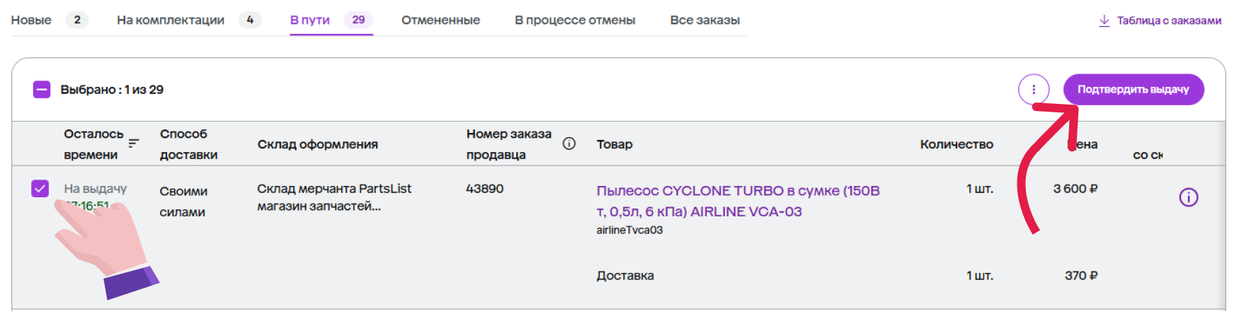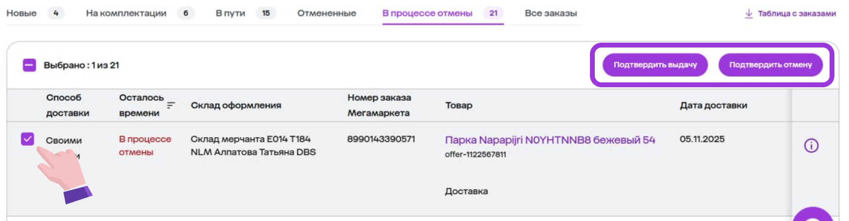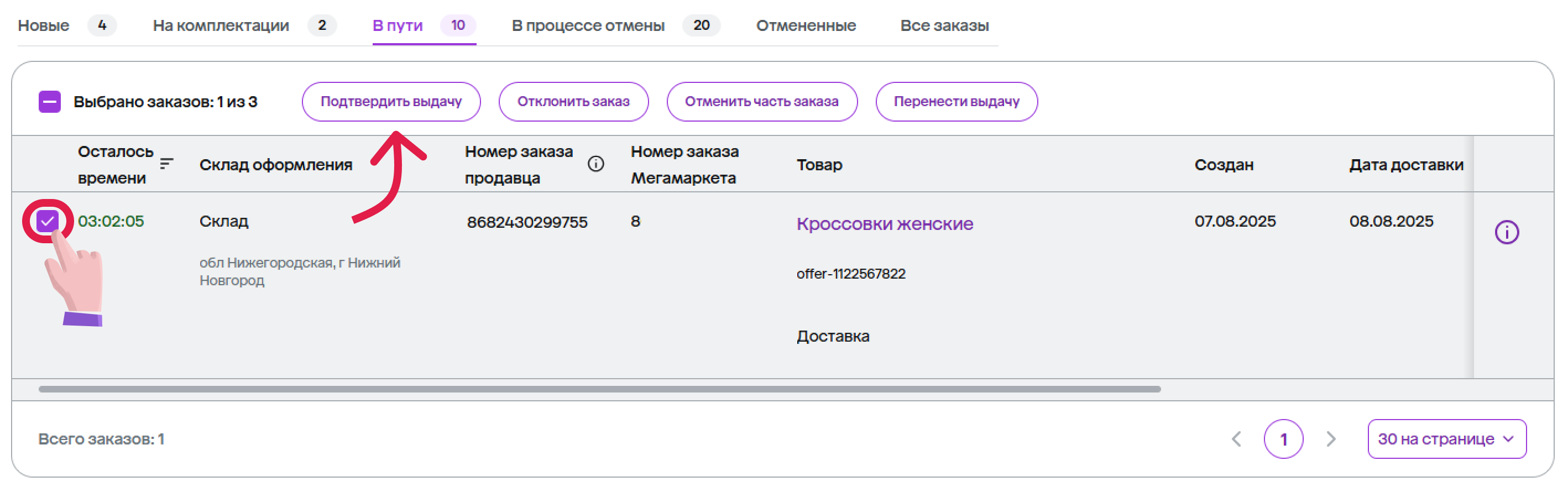 - Подтвердить выдачу — сообщить, что заказ на самом деле выдан покупателю;