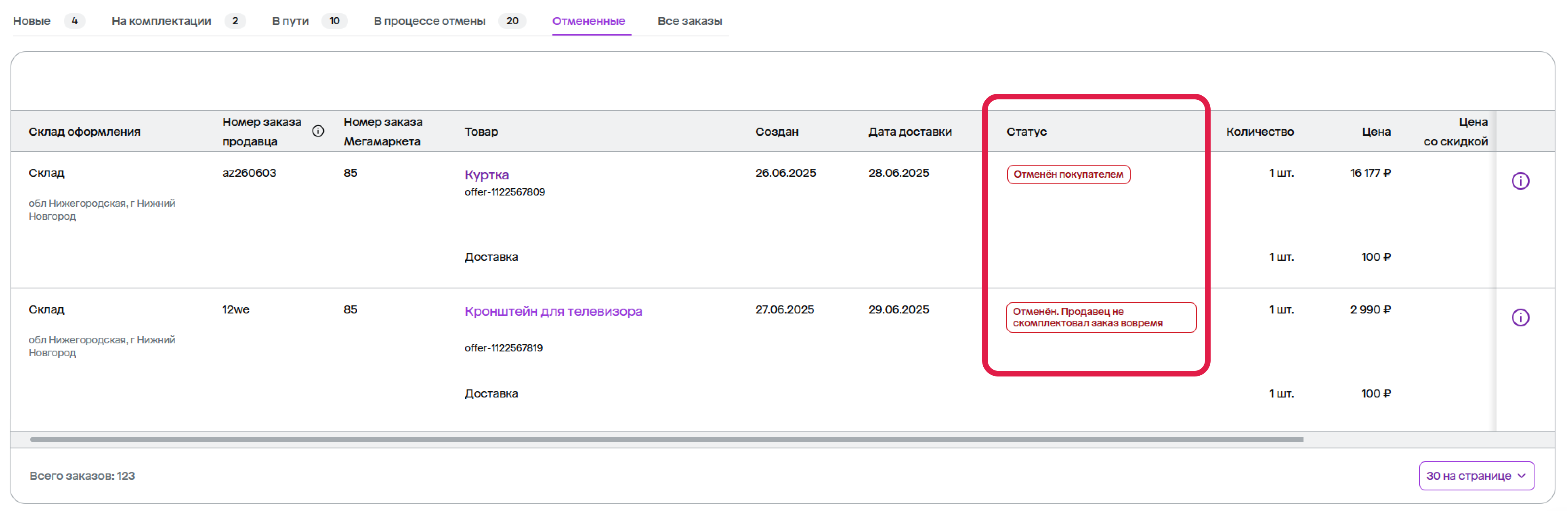 Отменённые | Заказы, отменённые вами либо покупателями. Тип отмены можно отличить по статусу |