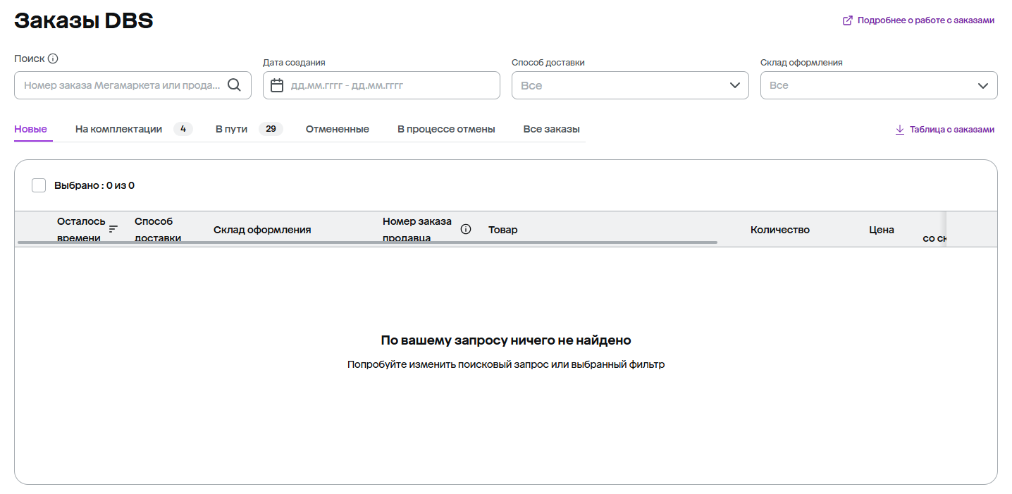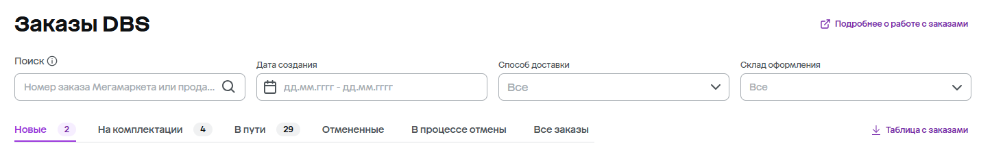 Раздел «Управление заказами DBS»