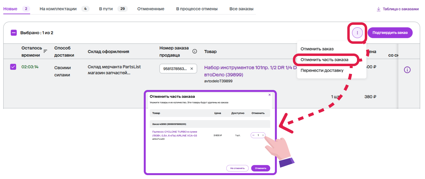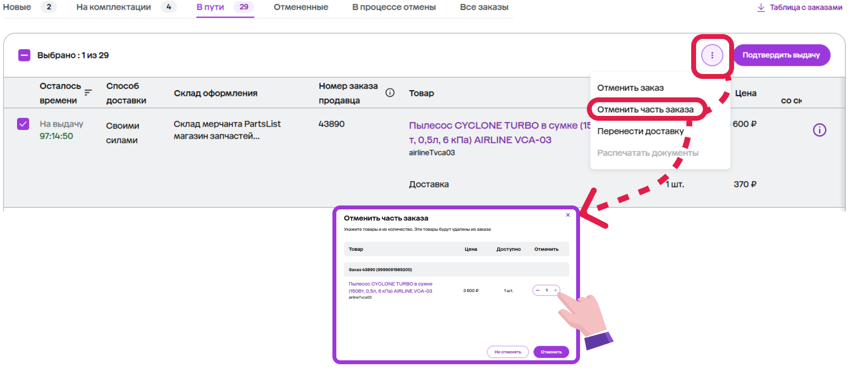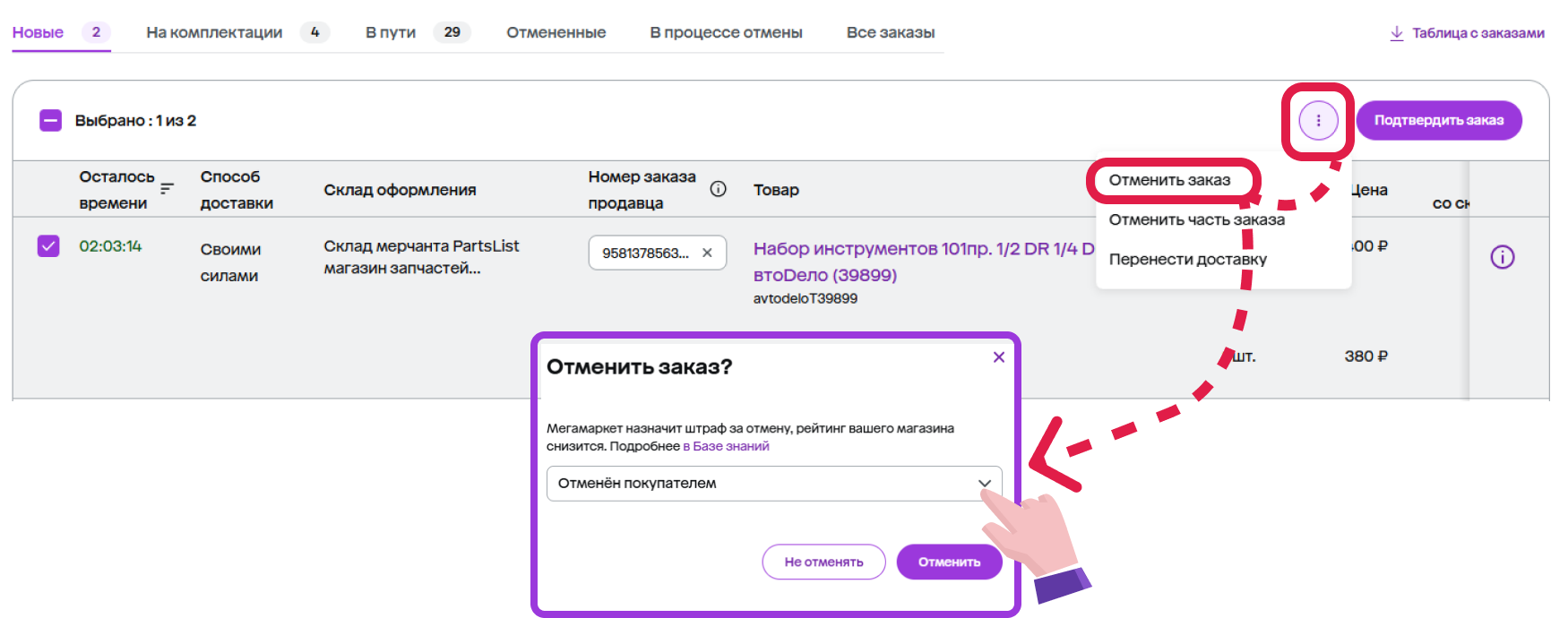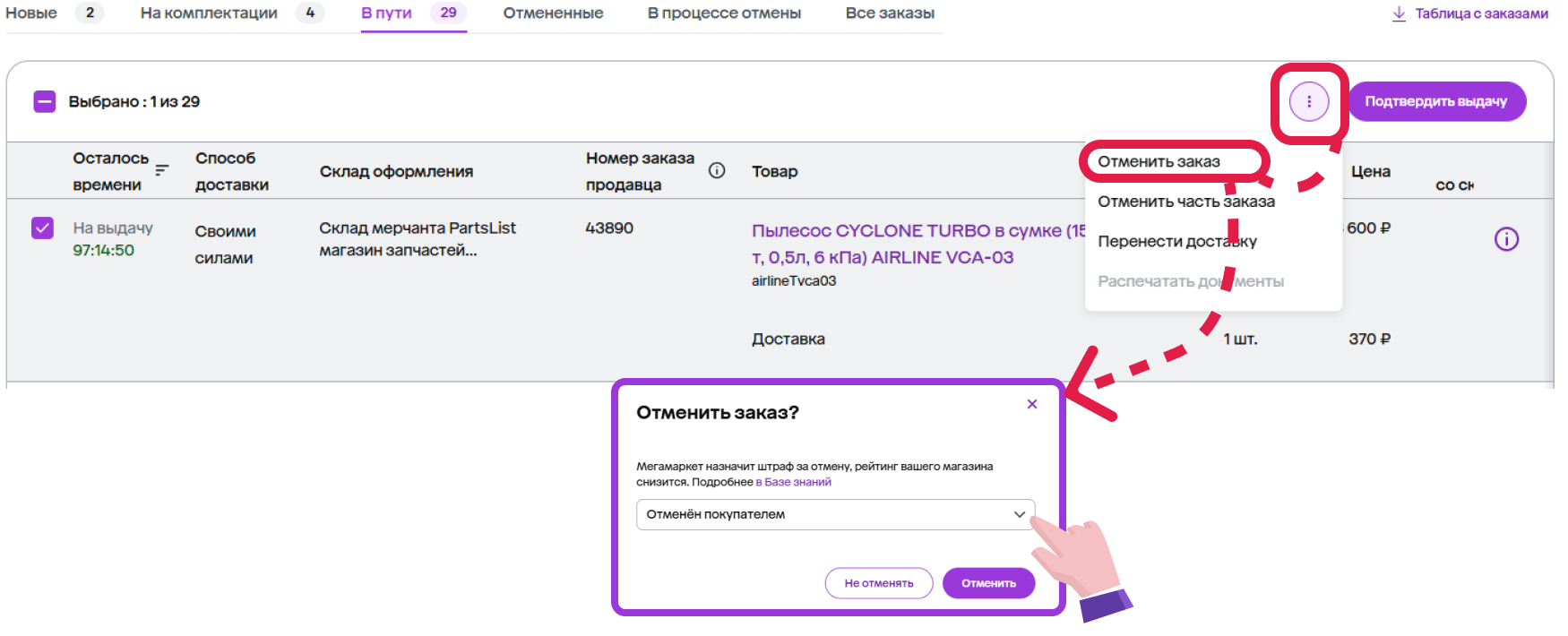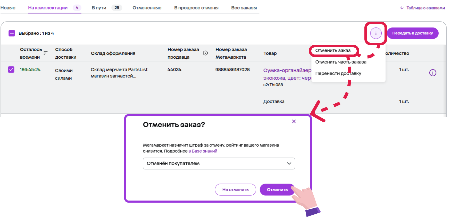 | В процессе отмены | Отправления, которые: 1) Отменил покупатель – покупатель может отменить заказ, который находится в статусе «Подтвердите заказ» и «Скомплектуйте заказ». 2) Вы не успели обработать в отмеченное время. У таких заказов нужно подтвердить или отклонить отмену. |