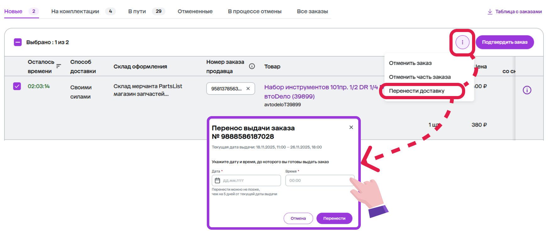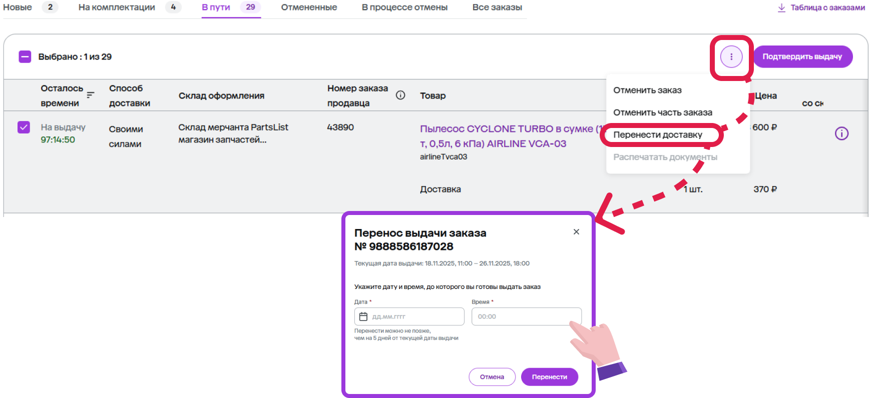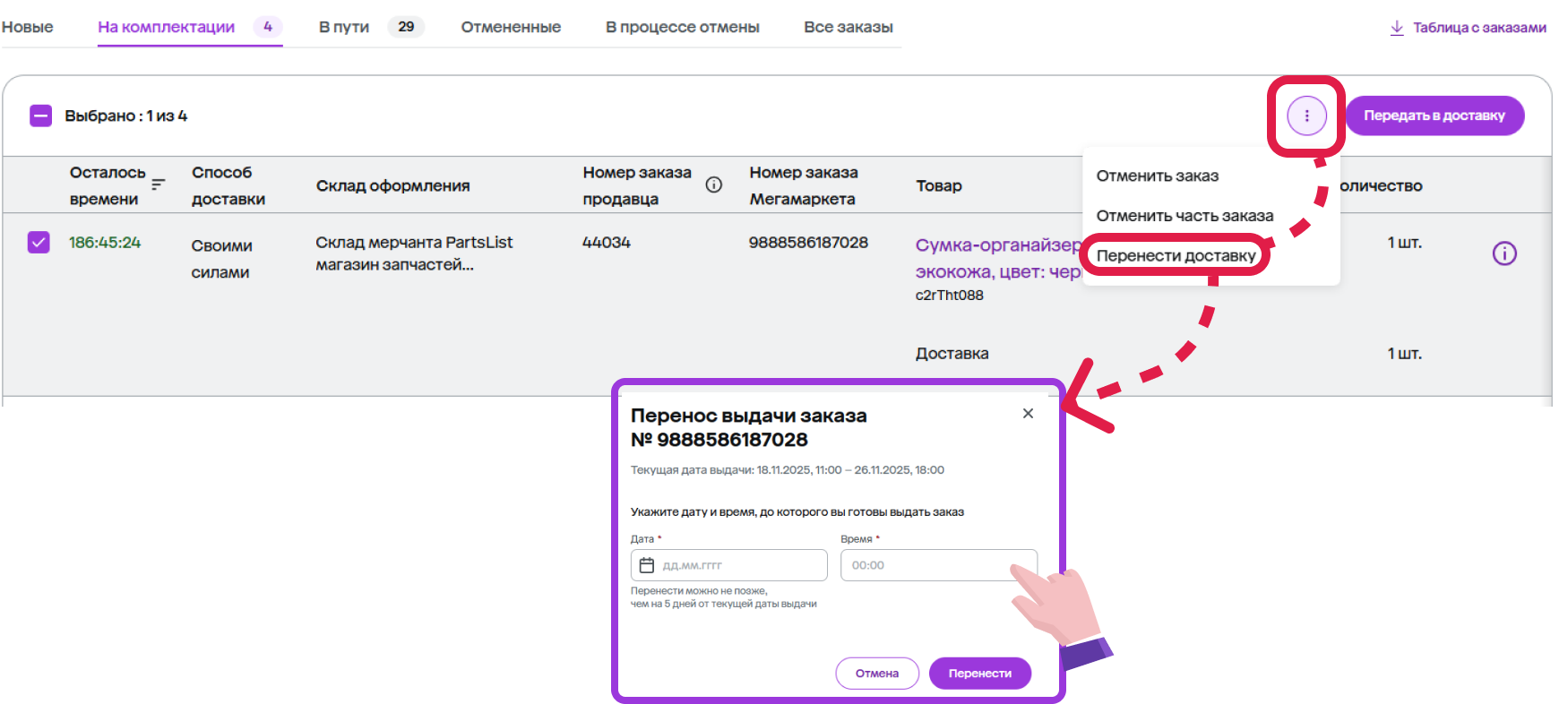 - перенести заказ;