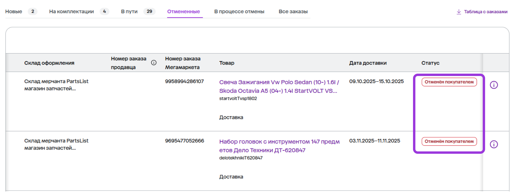 | Отменённые | Заказы, отменённые вами либо покупателями. Тип отмены можно отличить по статусу |