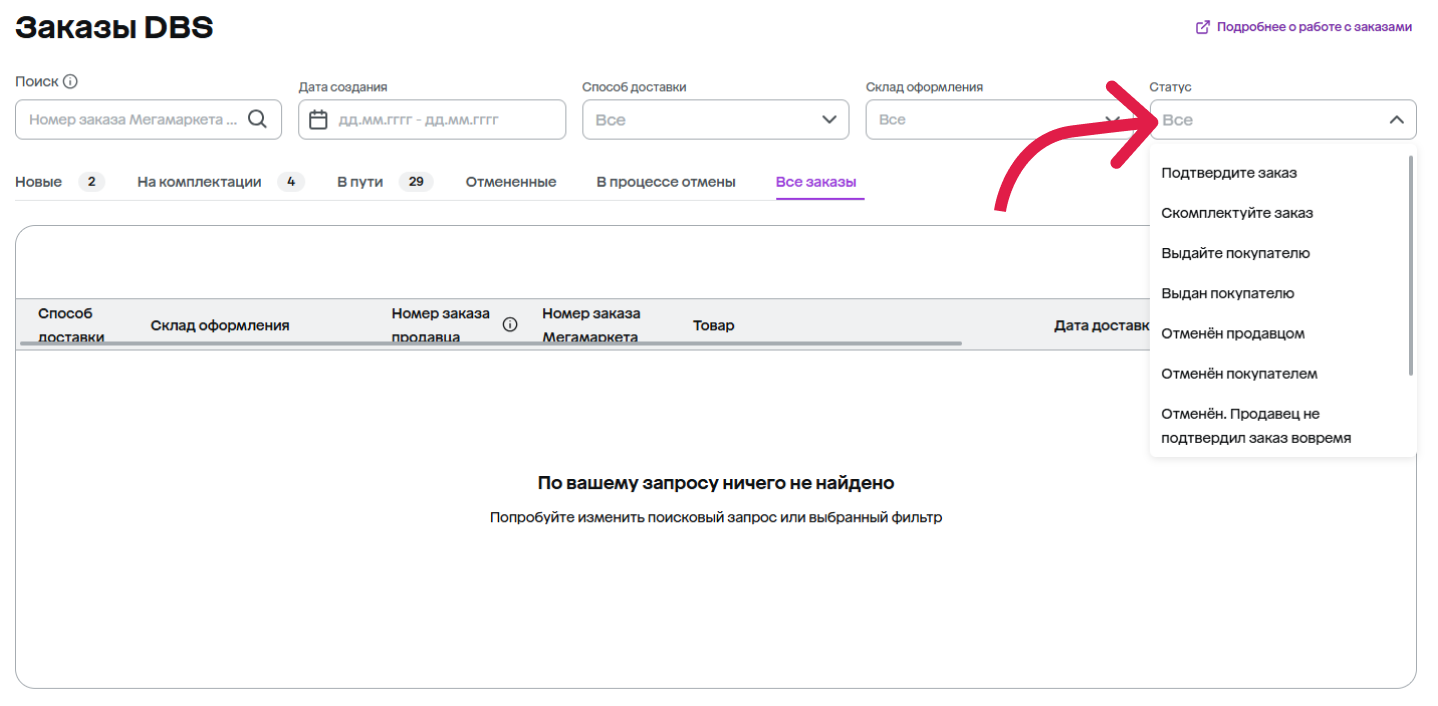 Здесь можно найти все заказы с определённым статусом — нужно только настроить фильтр.