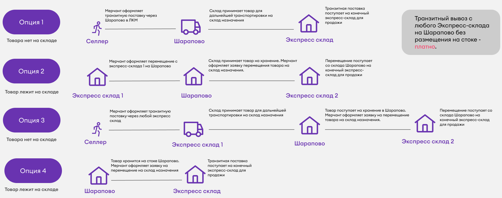 Мы перемещаем товары соответствующие условиям акции между любыми экспресс-складами через Шарапово бесплатно: принимаем грузы из любого склада, отправляем в любой пункт назначения, а также перемещаем со склада Шарапово в нужное место.
