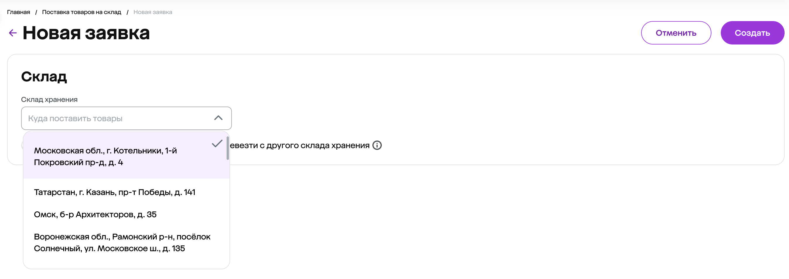 1. Откройте раздел Поставка на склад и нажмите Создать заявку.