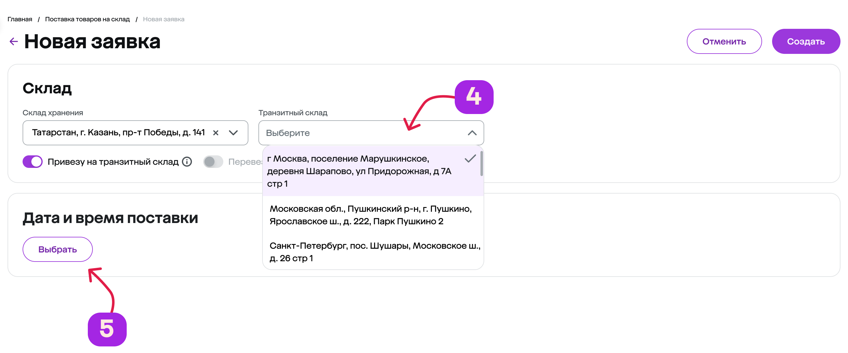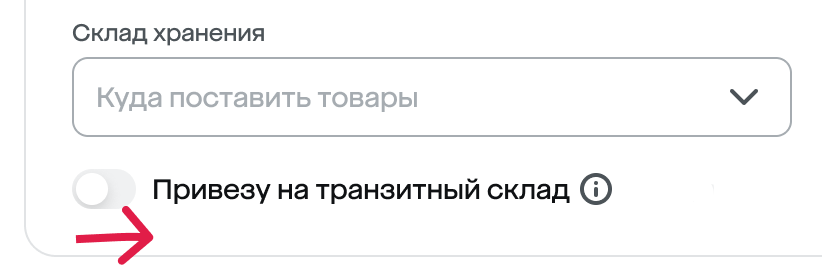 3. Сдвиньте переключатель в поле Привезу на транзитный склад. Откроются дополнительные поля.