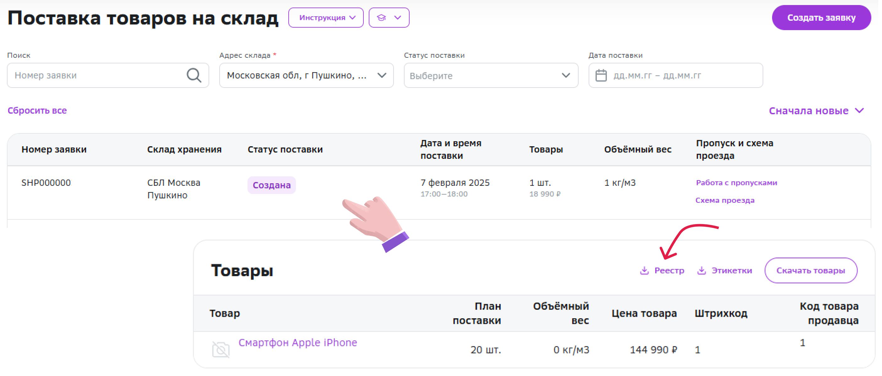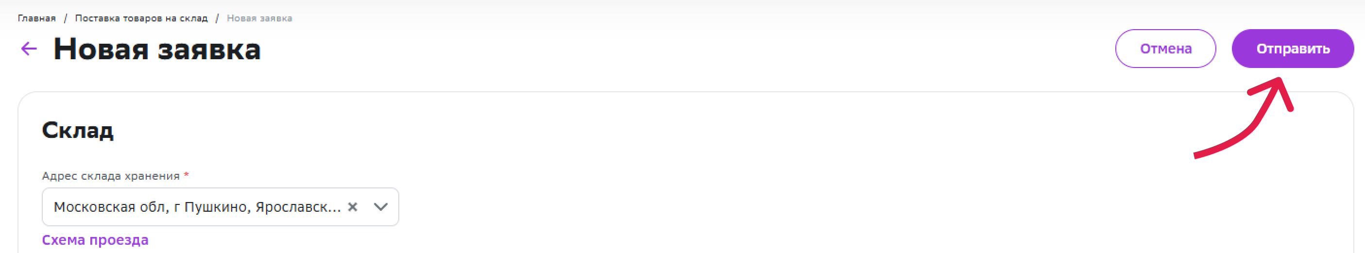 Готово. Заявка отобразится в разделе Поставка на склад с соответствующим статусом.