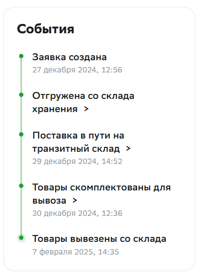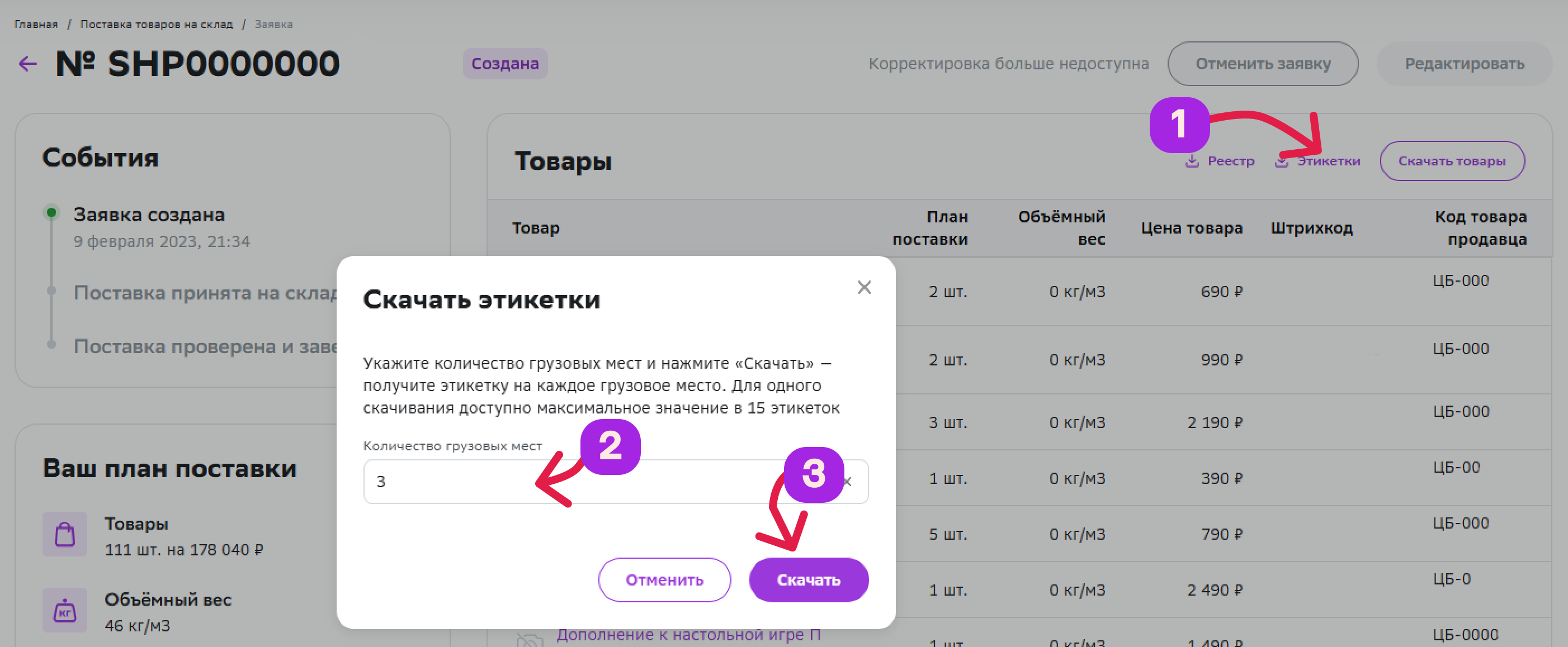 Создана | Заявка прошла проверку и создана. Её можно отменить или отредактировать не позднее чем за 2 часа до поставки товара на склад |