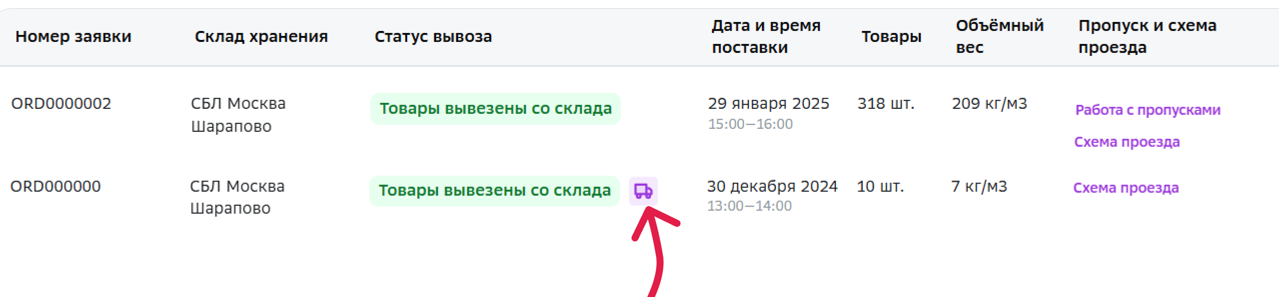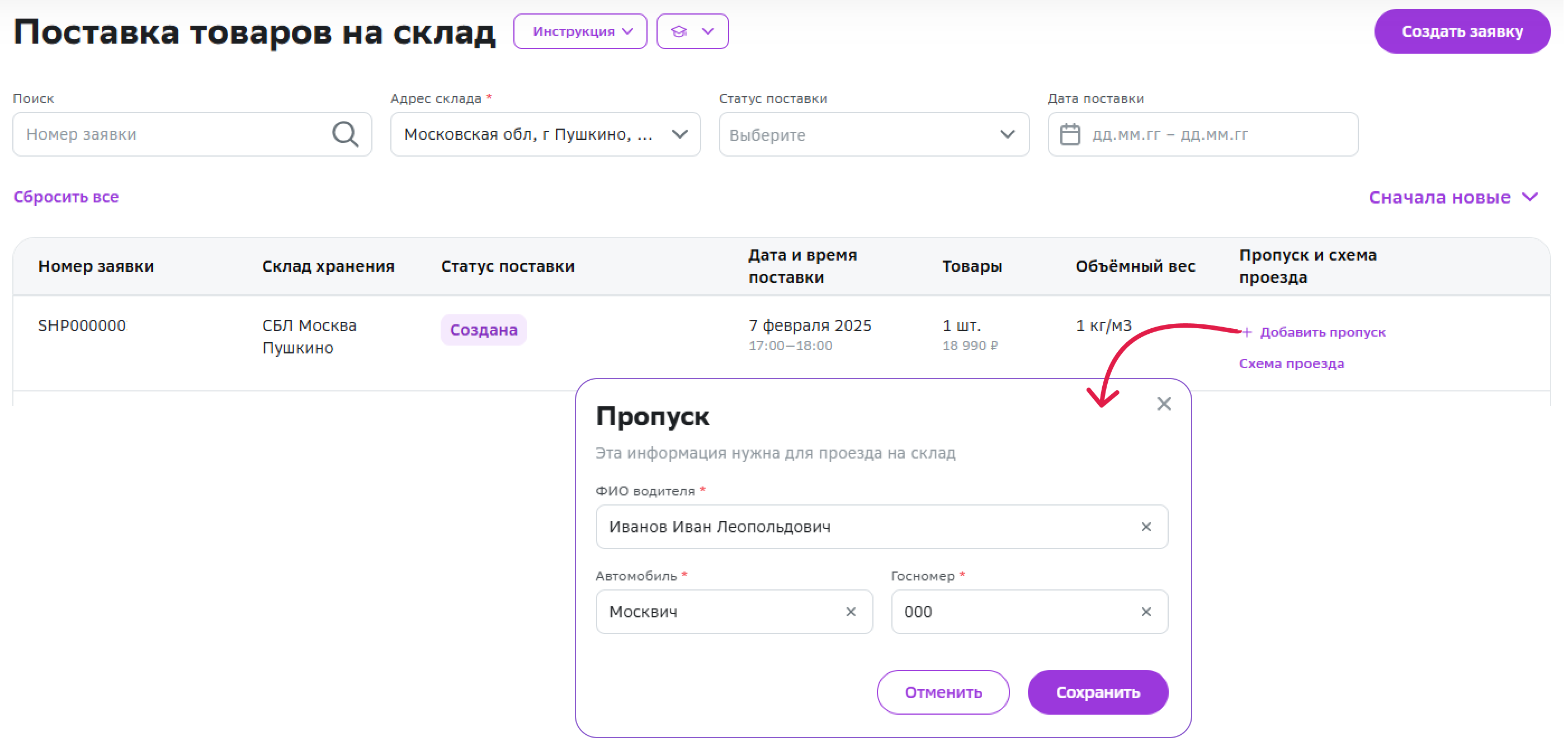 В разделе Поставка на склад нажмите Добавить пропуск.