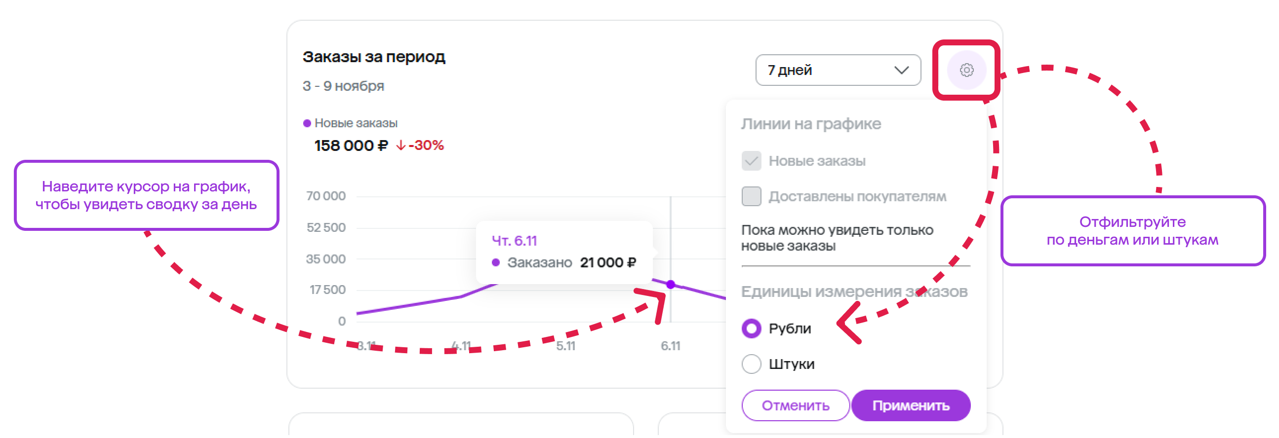 Он показывает все заказы, которые вам поступали. Его можно настроить, чтобы видеть информацию по заказам в рублях или штуках.