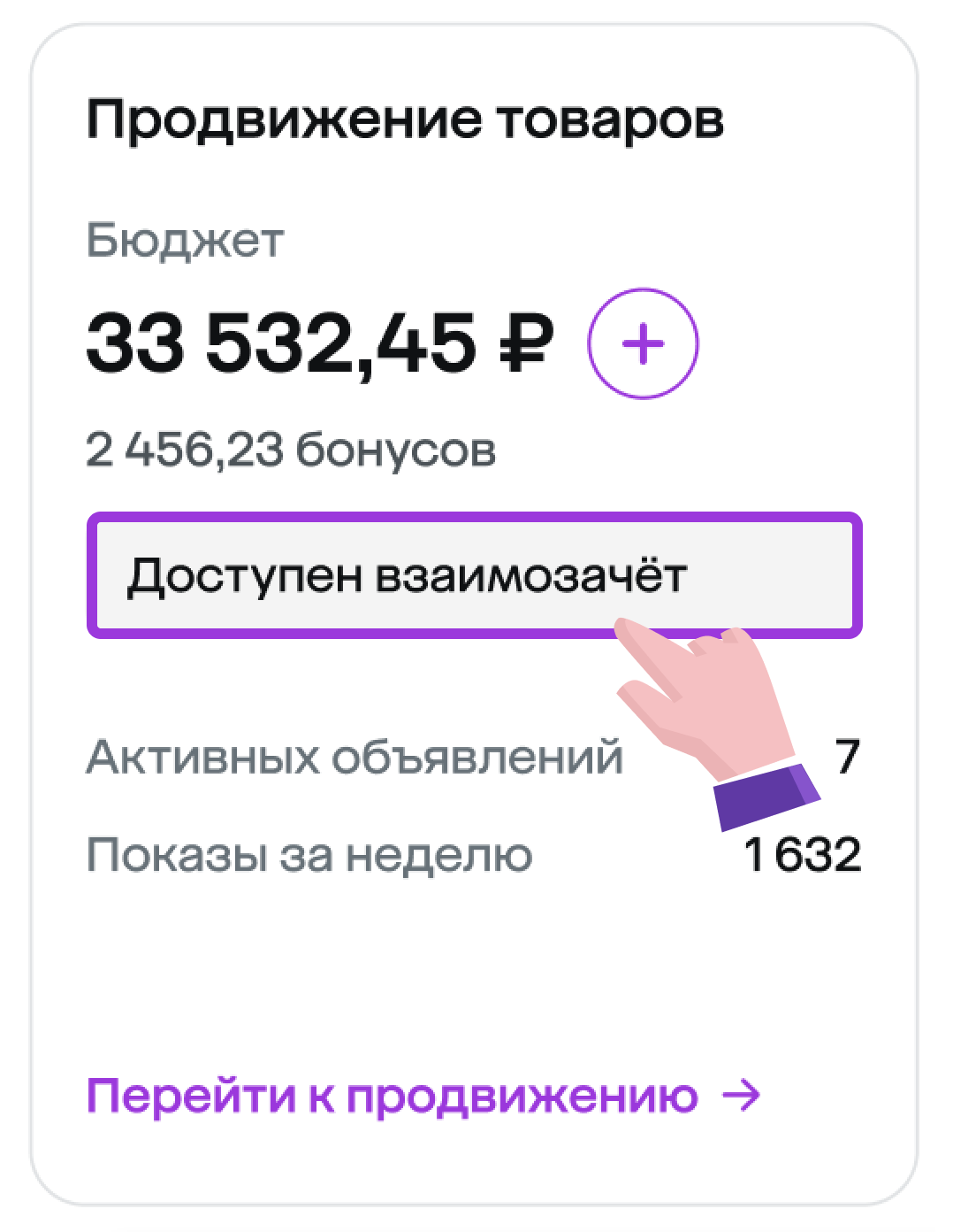 Здесь можно увидеть бюджет, имеющийся на продвижение, а также количество запущенных объявлений и показы по ним.