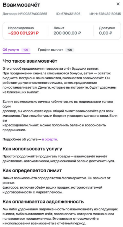Тогда отобразится подробная информация о взаимозачёте: лимит и сколько средств было израсходовано.