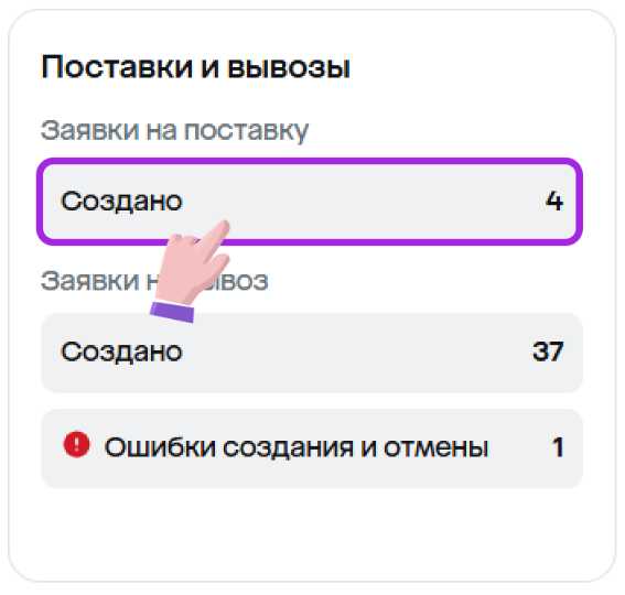 Если вы работаете по схеме «Хранение + Доставка от Мегамаркета (FBO)», у вас будет отображаться виджет с созданными заявками. Можно сразу перейти к поставкам или вывозу.