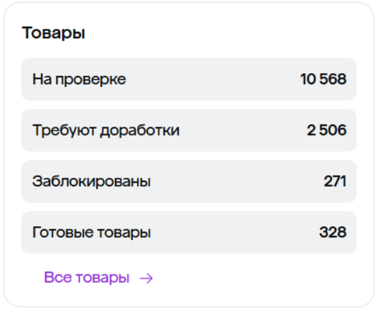 Виджет позволяет увидеть сводку по карточкам товаров. В соответствующий раздел можно попасть, кликнув на него.