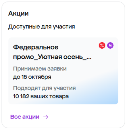 Для продвижения ваших товаров важно участвовать в акциях. Подробнее о них рассказываем в другой статье.